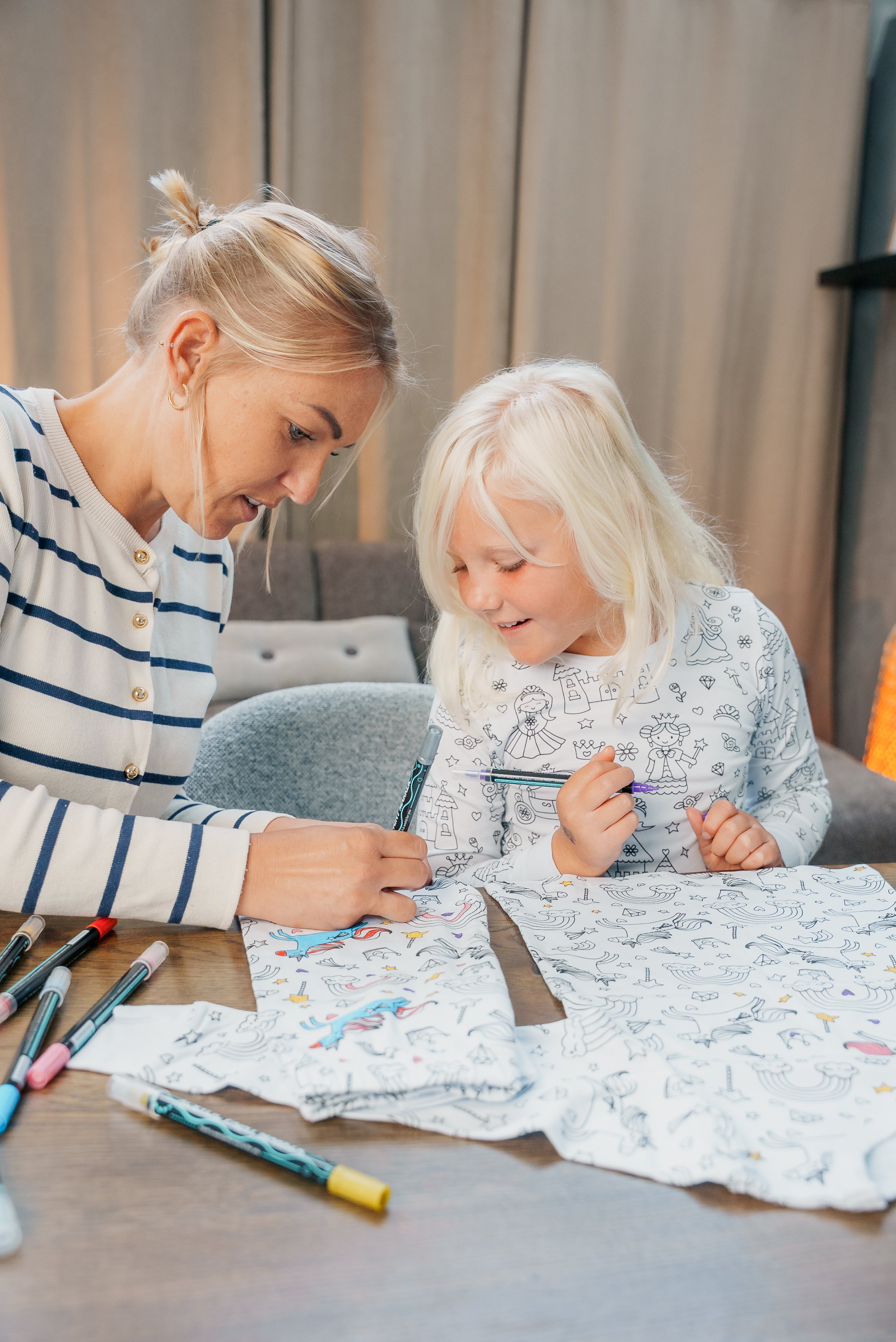 Med vores tegne-pyjamas får I en hyggelig, kreativ aktivitet, der samler jer omkring bordet og giver de små en følelse af stolthed og ro.